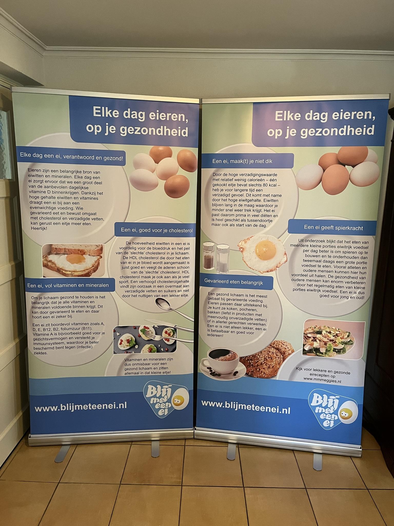 Op deze banners staan de tekst en foto’s van de folder Elke dag eieren, op je gezondheid. Mooi voor een open dag, excursie of zichtstal. De banners zijn eenvoudig op te zetten en in een handzame tas te vervoeren.
